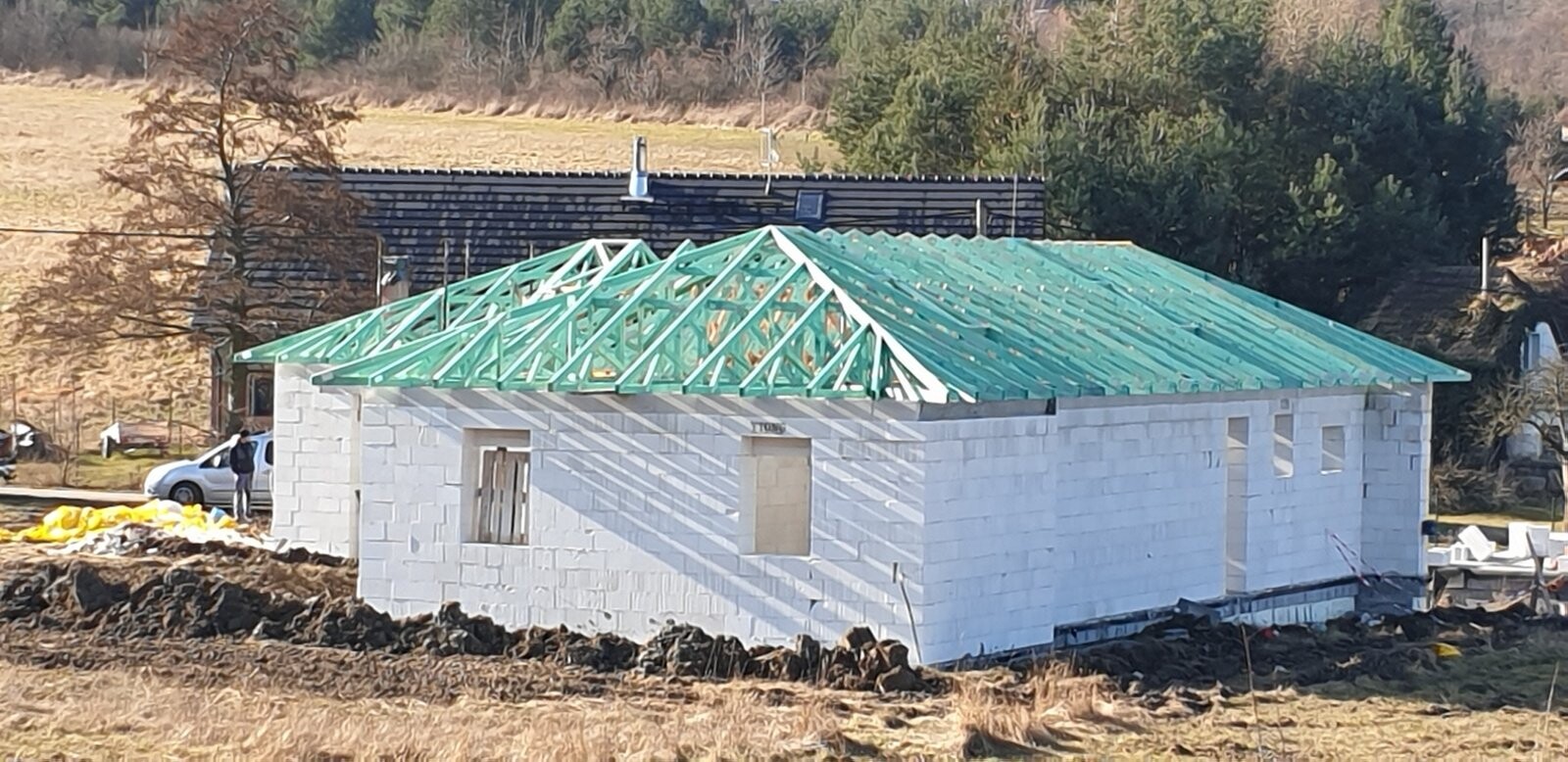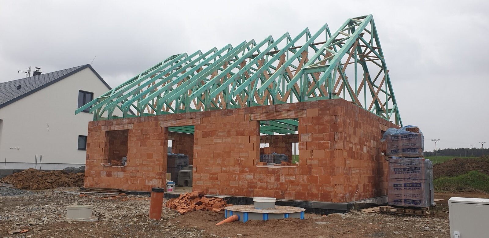POPIS: Montáž krovu a vazníků, fólie, latí a pokládka plechové krytiny.