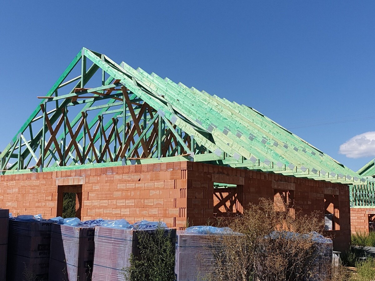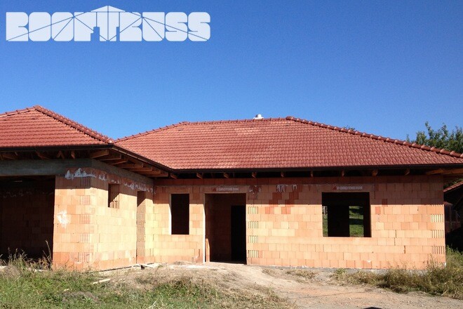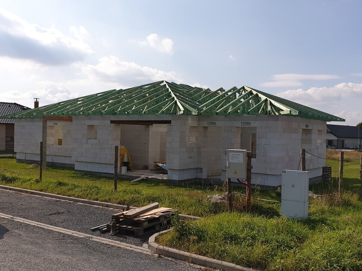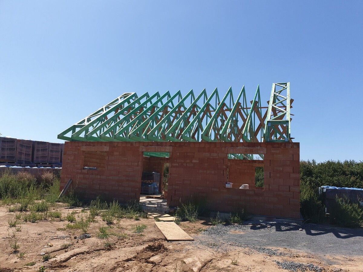 POPIS: Montáž vazníků, latí, fólie, pokládka pálené tašky a klempířské práce