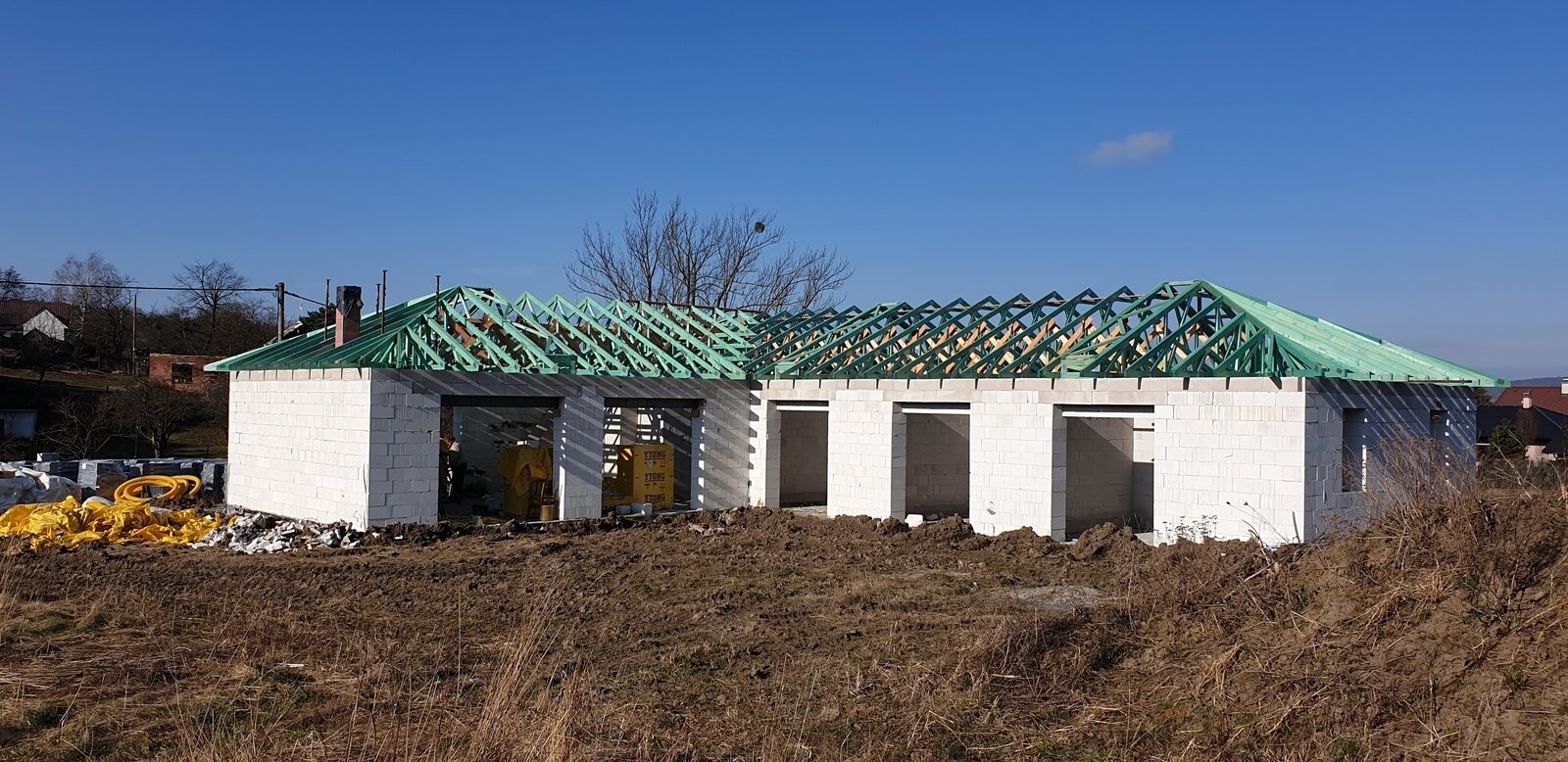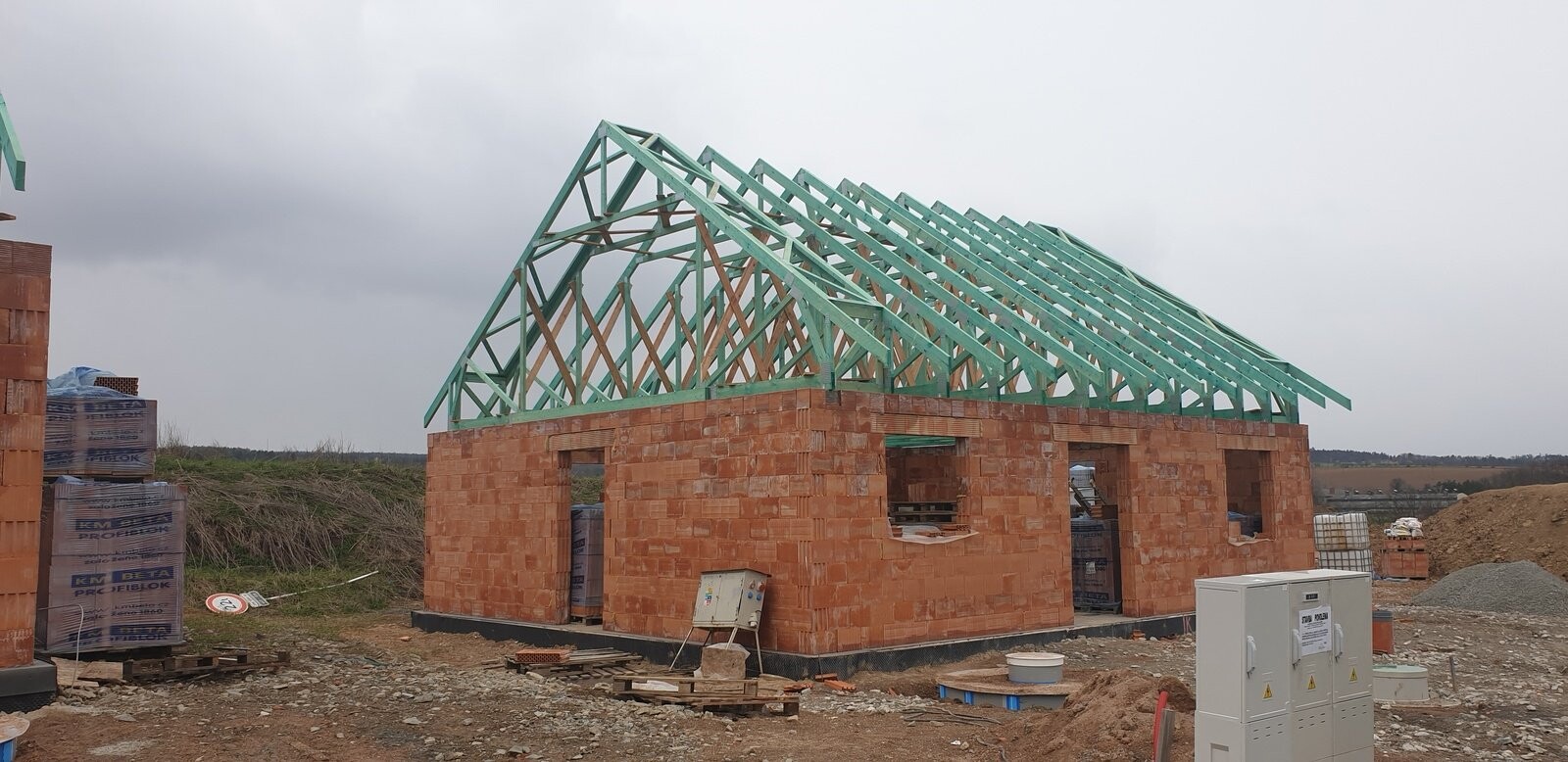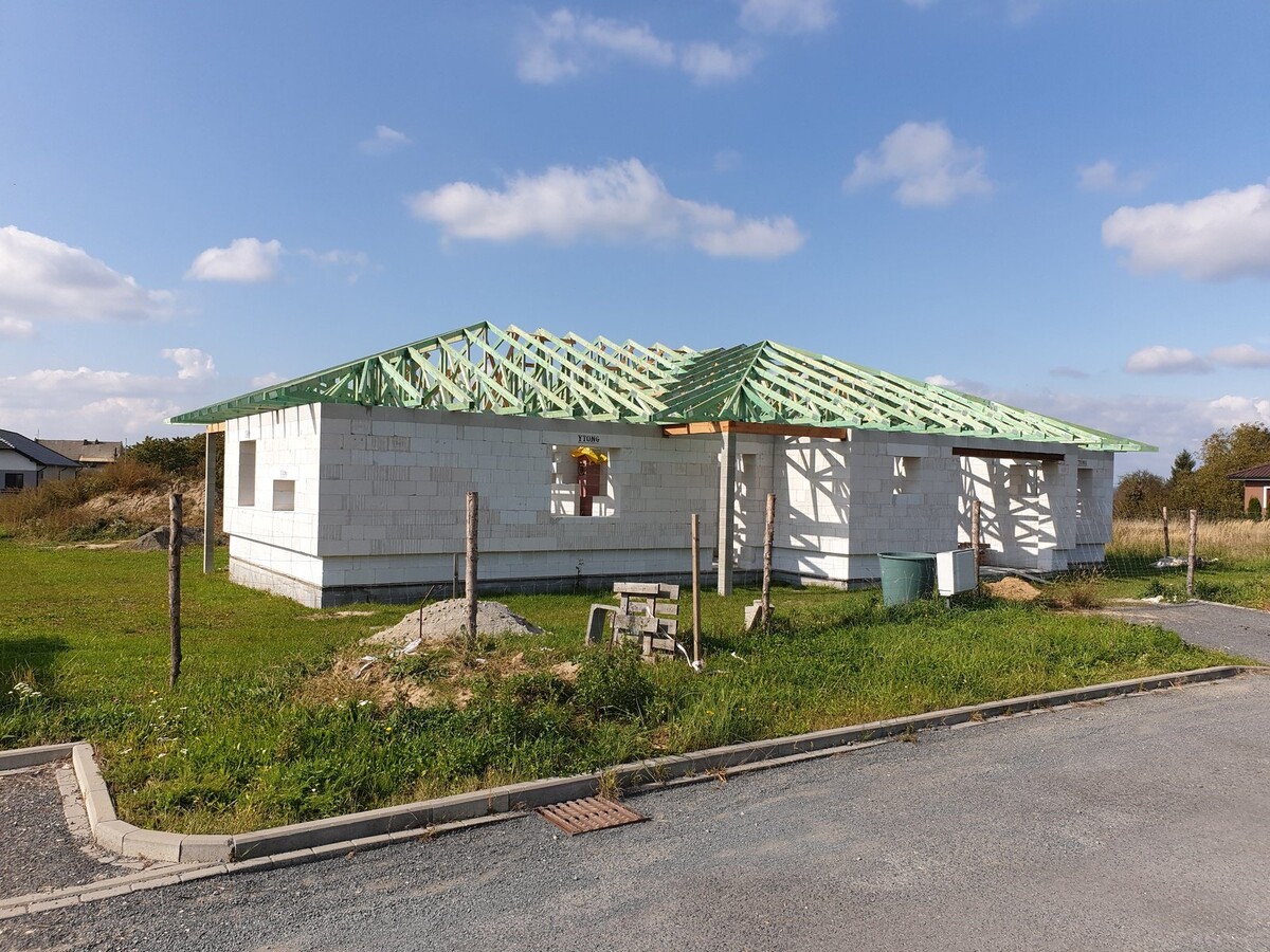 POPIS: Montáž vazníků, latí, fólie, pokládka pálené tašky a klempířské práce
