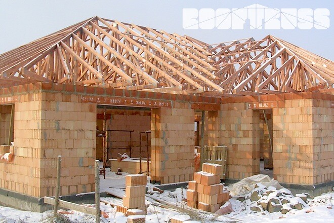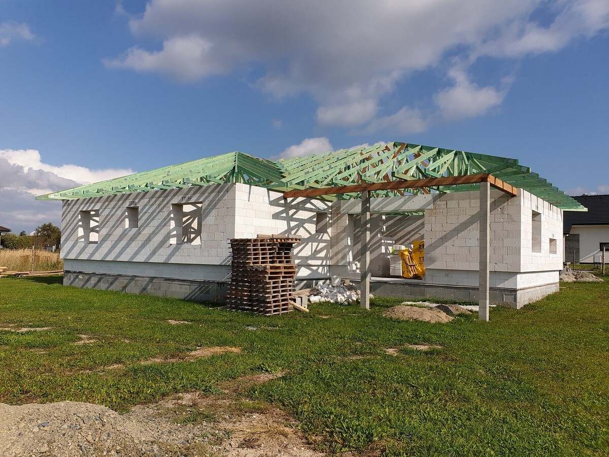 POPIS: Montáž vazníků, latí, fólie a pokládka krytiny