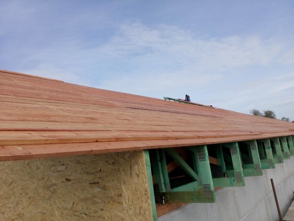POPIS: Montáž vazníků, fólie, latí a pokládka plechové krytiny, záklop z Cetris desek